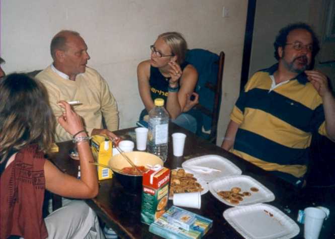 Oh surprise ! 2 profs étaient venus nous rendre visite (condition sine qua non pour obtenir une nuit de folie : inviter au moins un adulte responsable ;o))! Michel Seys (illustre professeur de math) et Michel Roulin (illustre...euh....professeur de français, porté sur la chanson et sur autre chose de pas net (quoique on ne le voit pas à l'image, puisqu'il n'y a que du jus d'orange et du thé froid sur la table ;o))) entourent Célinette pouet pouet !